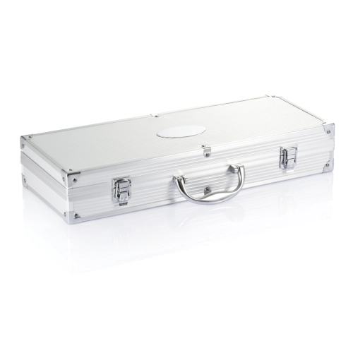 12 pcs stainless steel barbecue set, including 4 pcs skewers, carving knife, 4 corn holders, spatula, carving fork with protection cover and pair of tongs. Packed in aluminium case with hinges and handle.