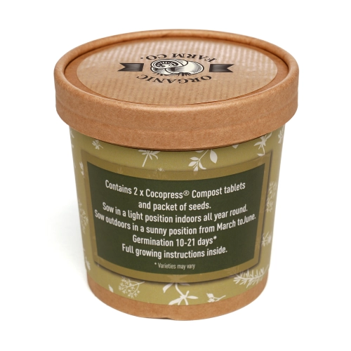 12oz natural paper cup containing two Cocopress® compost tablets, a seed packet with various varieties to choose from including Basil, Chamomile, Chives, Fennel, Herb mixture (Basil & Chives), Mint, Parsley, Sage along planting instructions and a branded paper label to the lid.